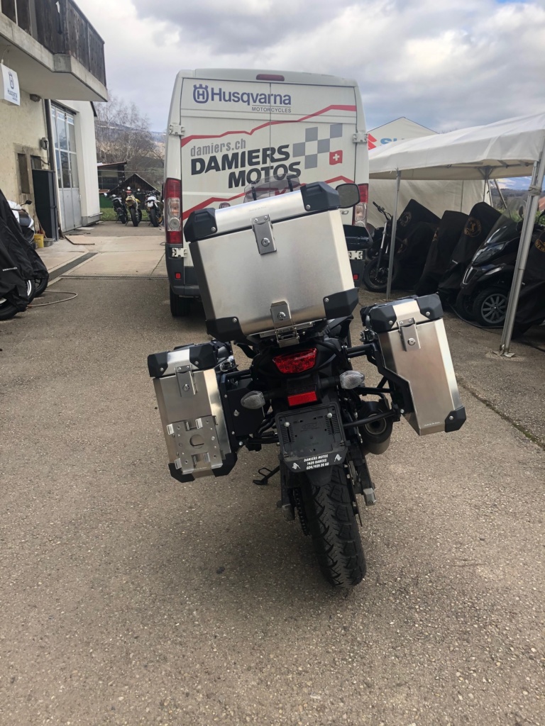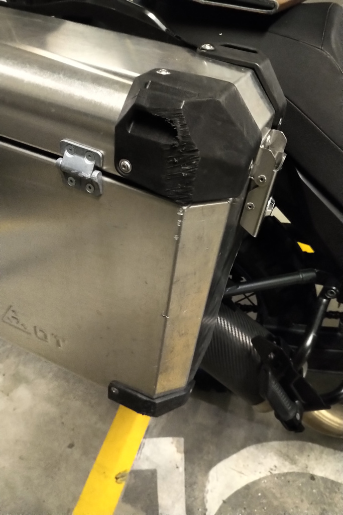 celle ci est une photo de la valise droite après une chute sur route a 50 km/h, comme vous pouvez le voir, il n’y a quasiment pas de dégâts, la protection plastique peut etre commandée pour un prix plus que correct … temps de réparation estimé … 2 minutes … essayez d’en faire autant avec des valises a moitié plastiques comme on en trouve partout …